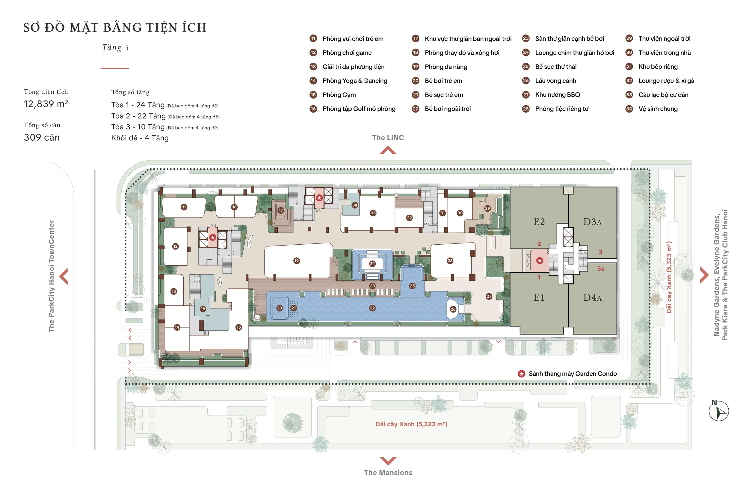 Tầng 5 bắt đầu xuất hiện các căn hộ ở (được ký hiệu là E1, E2, D4A, D3A trên sơ đồ). Các căn hộ tại tầng này sở hữu lợi thế đặc biệt là tiếp cận trực tiếp với toàn bộ hệ thống tiện ích cao cấp ngay ngoài cửa nhà.