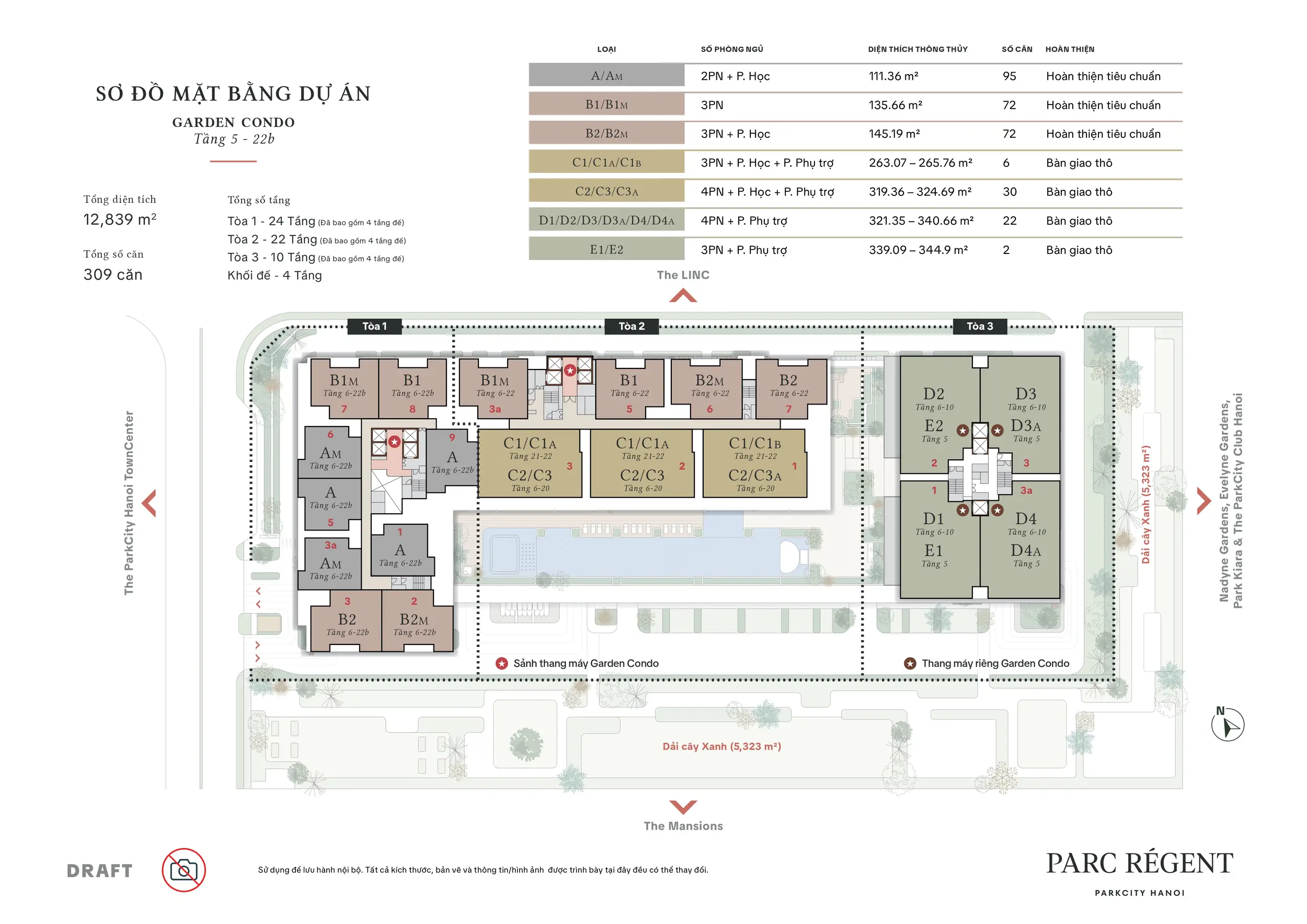 - T1: 24 tầng (L1-L4: Podium, L6-L24: Căn hộ)